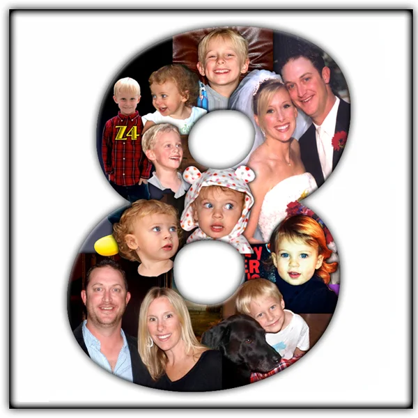 The cost of a photo-customized number depends on the number of incorporated images. This approach can cost as little as $49.95; or as much as $125 for a composite more like the one above. Ask about adding the final composite to a special WEB page!